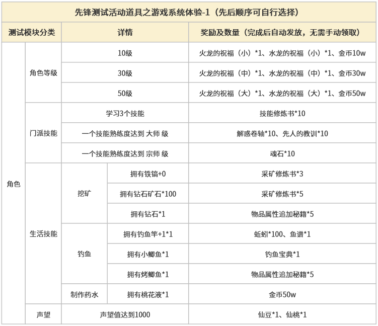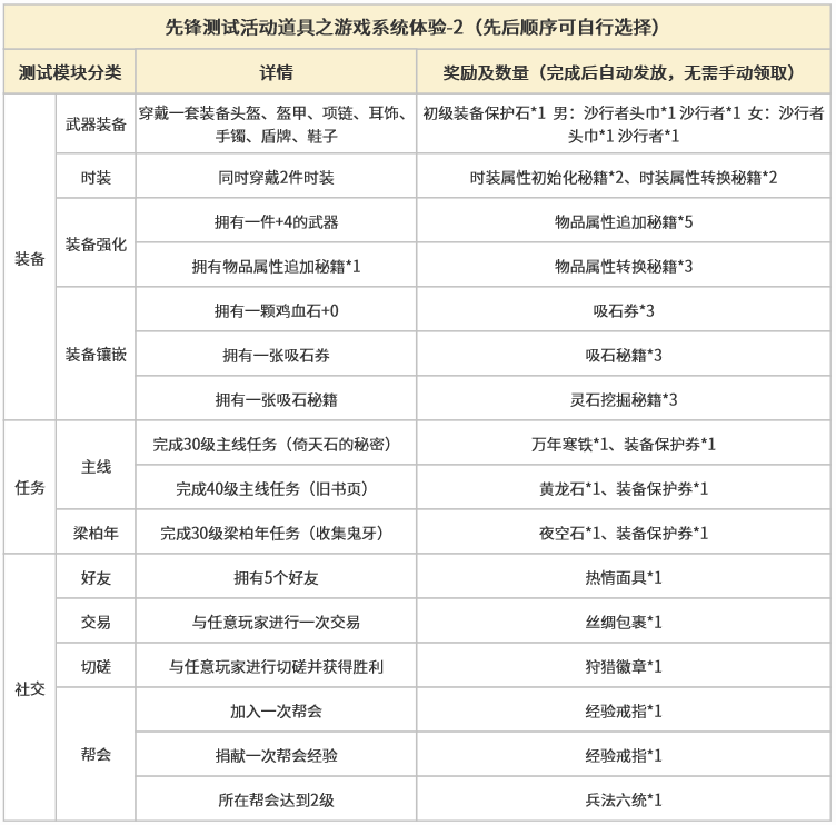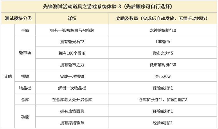 为了更好的体验游戏内容,各位觉醒者可根据【先锋测试活动】道具指引,进行游戏系统体验。完成下方表格中对应模块并提交后,奖励自动发放至物品栏。