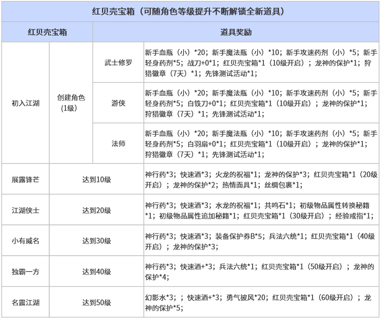 所有角色创建成功后,将获得道具【红贝壳宝箱】,自动放置于物品栏。红贝壳宝箱包含【先锋测试活动】道具以及其它道具(见下表)。